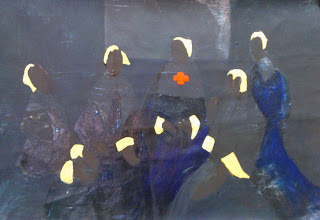Ik neem zelfs die kleur weg, en laat enkel de kanten mouwtjes en hoofddekseltjes oplichten. De strenge jurken van enkele vrouwen zijn in glanzende acryl geschilderd, wat de jurken volume geeft. Verder zijn de figuren ontlevend.